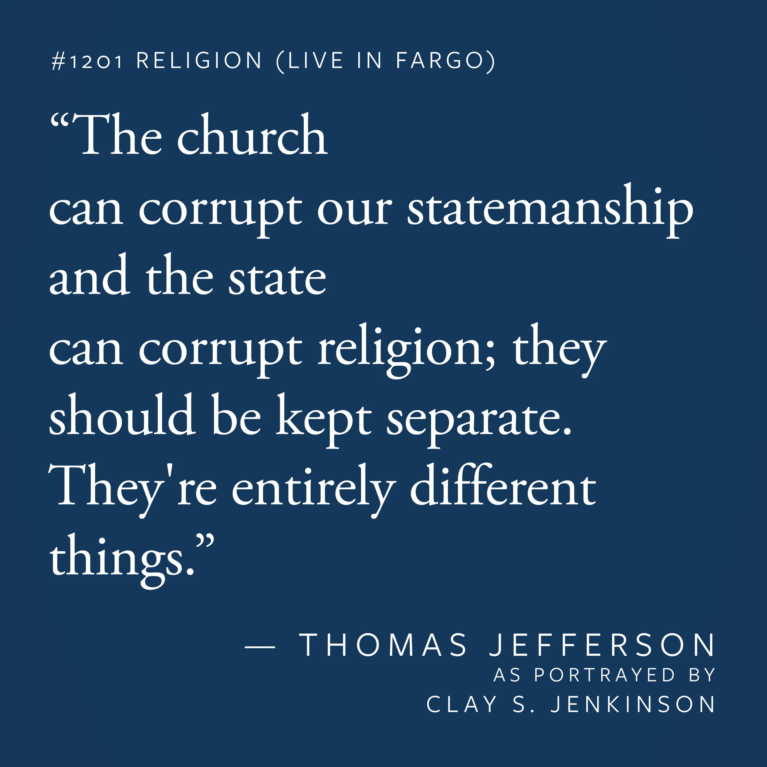 Bill Thomas of Prairie Public Radio is this week’s host of a live performance of the Thomas Jefferson Hour in Fargo North Dakota. The subject Bill chose to speak about with President Jefferson (as portrayed by humanities scholar Clay S. Jenkinson) is religion.