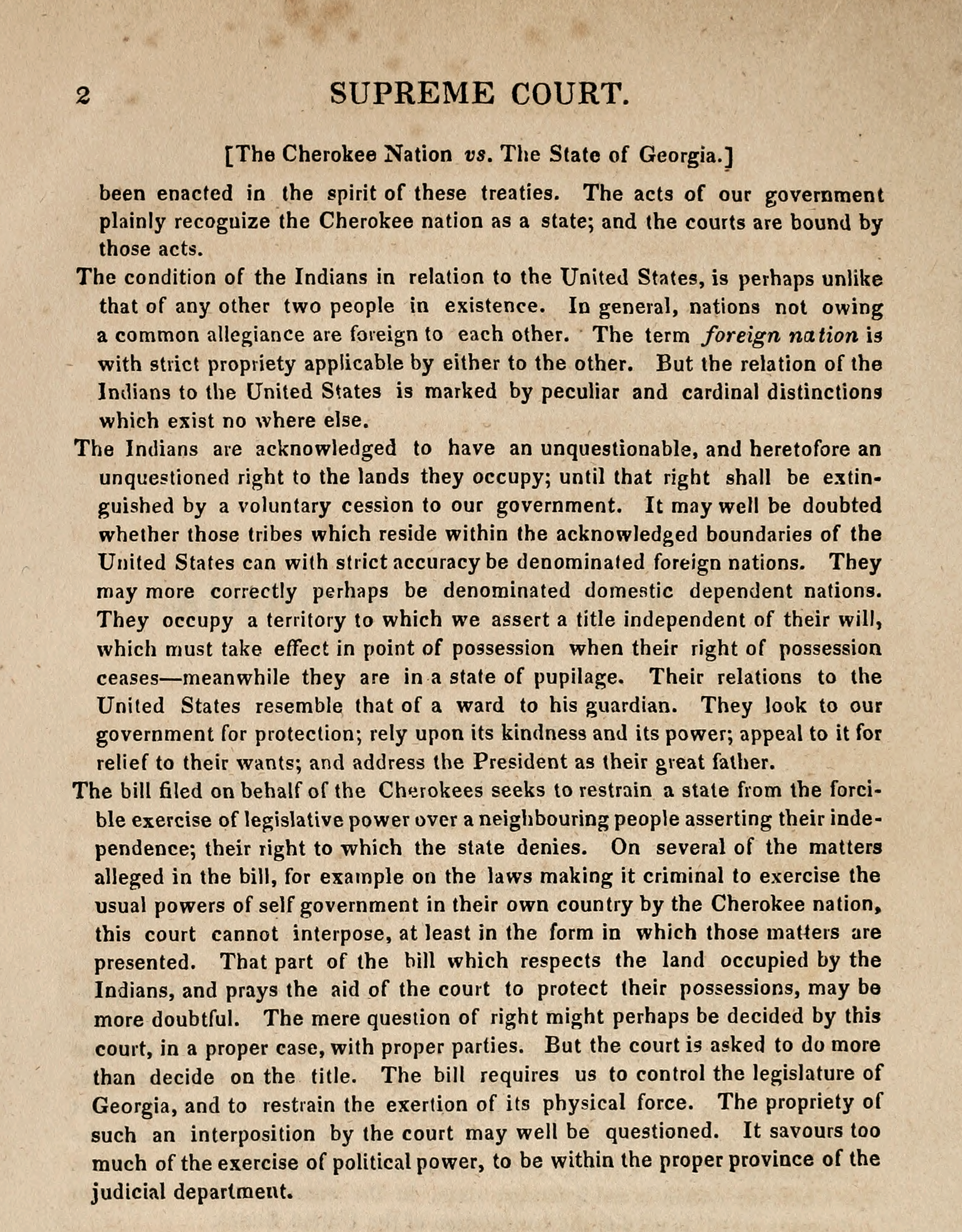 Chief Justice John Marshall, who served on the Supreme Court from 1801 to 1835, described Native American tribes as "domestic dependent nations" in the 1831 case of the Cherokee Nation v. Georgia. This case, along with two others, are the Marshall Trilogy which created "the basic framework of federal Indian law in the United States".