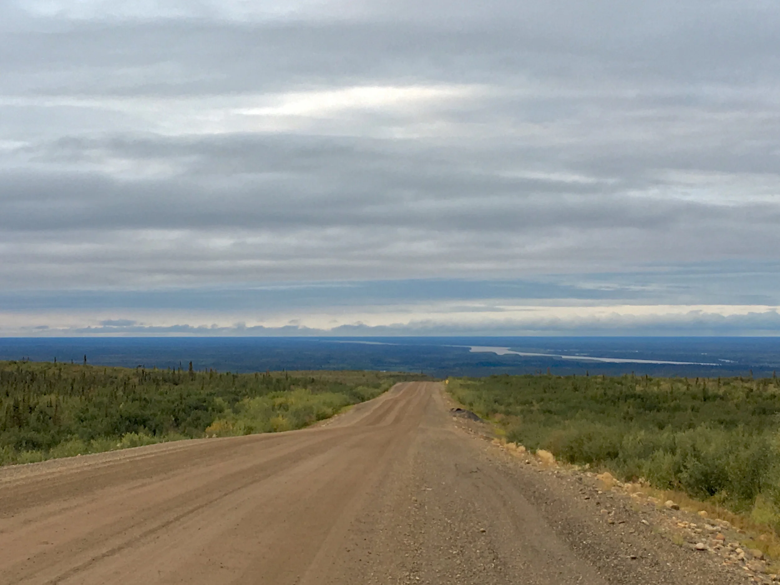 View of the Mackenzie River Delta from the lower elevations of the Richardson Range, the northernmost segment of the Rocky Mountain cordillera. The thin lines of the Mackenzie River can be seen to the center right of the image, and the Arctic Ocean itself just below the cloud line.